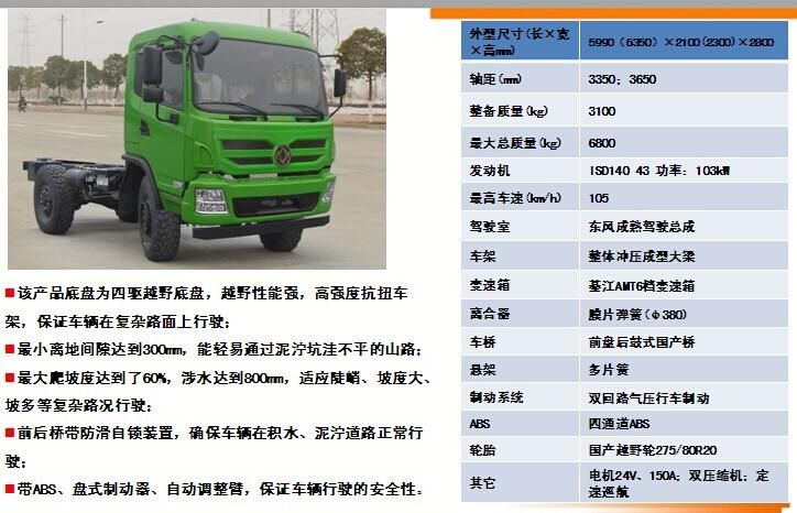 EQ2070GZ4DJ越野四驅(qū)底盤的詳細描述:該產(chǎn)品底盤為四驅(qū)越野底盤,越野性能強,高強度抗扭車架,保證車輛在復(fù)雜路面上行駛時,不會出現(xiàn)大梁斷裂等情況;最小離地間隙達到300mm,能輕易通過泥濘坑洼不平的山路;最大爬坡度達到了60%,適應(yīng)陡峭、坡度大、坡多等復(fù)雜路況行駛。前后橋帶防滑自鎖裝置,確保車輛在積水、泥濘道路正常行駛;帶ABS、盤式制動器、自動調(diào)整臂,保證車輛行駛的安全性。