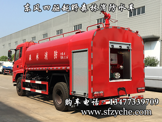 東風新款四驅越野森林消防灑水車_東風11.1噸四驅消防水車_國五四驅越野森林滅火水車_東風4×4越野SCS5183GPSEQ型四驅綠化噴灑車簡介:采用東風EQ2180GD5DJ型越野汽車底盤,東風D913新款駕駛室,4×4驅動,康明斯ISB190 50國五發(fā)動機,六檔變速箱,東風商用車橋,前驅動橋3.8噸,后橋10噸,10.00R20輪胎,軸距4500mm,電動玻璃,方向助力,斷氣剎,ABS。罐體采用優(yōu)質(zhì)碳鋼Q235板材,板材厚度4mm,罐體容積11.1立方,安裝夾心取力器,后置泵箱,消防栓接口左右各一個,消防炮采用PS30-50D消防水炮,流量40L/S/1.0MPa 水射程:≥50m,消防泵采用常壓消防泵型號:CB10/40車用消防泵,流量:40L/s,壓力:1.0MPa,帶前沖,駕駛室頂部安裝長條警燈帶喊話器,全車顏色橘紅,兩側噴涂白色森林消防字樣。