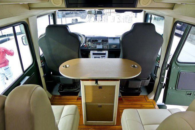 越野房車內(nèi)飾:可以看到,柚木地板外加兩個電動座椅與一個帶儲藏柜的可移動多功能桌構(gòu)成了這輛越野房車的第二排。除此之外,頭頂上方安置有26寸索尼液晶電視和帶衛(wèi)星電視機(jī)頂盒的藍(lán)光播放器,微波爐烤箱、小型冰箱、電磁爐等常用設(shè)備也是一應(yīng)俱全,當(dāng)然恒溫式的出水系統(tǒng)以及真空馬桶、獨立淋浴也是一樣不少。具備天窗和側(cè)窗的尾箱處安置有兩張舒適的標(biāo)準(zhǔn)床鋪,可以說盡管這輛U5000并非加長特裝版,但所有居住設(shè)備都很齊全。