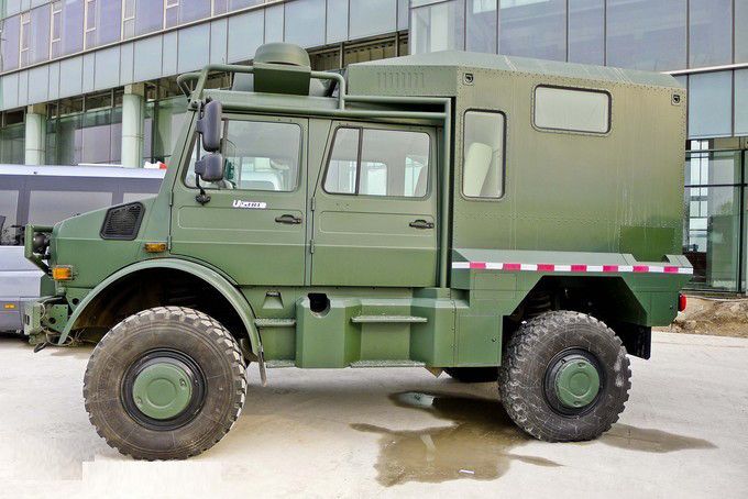 底盤介紹:烏尼莫克U5000擁有兩種軸距分別為3250mm和3850mm,6m的車身長度配合將近2.5m的寬度讓車內(nèi)的空間利用率發(fā)揮到了極致。車頭部分的高度已經(jīng)將近3m,如果加上后加裝的車廂,各位可以想象遇到較低的限高時是多么尷尬。門式車橋在此無需多言,接近500mm的離地間隙,再加上1.2m的涉水深度足以面對所有極限路況,此外選裝軍版套件的涉水深度可以達(dá)到1.5m。其零部件及電氣元件有防水保護(hù)、再配合防水式前大燈,輪轂、制動器密封等讓這輛猛獸無所不能。除了基本的車身防護(hù)裝備,“鵝頸式”縱梁的布置,使梯形車架與兩個相對的縱梁構(gòu)成一個U字型,并焊接在管狀縱梁上,可允許橫縱梁產(chǎn)生較大的扭轉(zhuǎn)度,通過橫向推桿與螺旋彈簧間的聯(lián)動,能實現(xiàn)高達(dá)30度的車橋?qū)桥で。而三點式懸掛也是烏尼莫克實現(xiàn)極端越野的關(guān)鍵之一,當(dāng)車輛需要對角行駛以越過高差超過0.5米的障礙物時,三點式懸掛可以保證車輛形成大角度移動和扭轉(zhuǎn)。相對于粗狂的外形,烏尼莫克式的內(nèi)飾也顯得相當(dāng)質(zhì)樸,在提倡減少控制面板按鈕的時代,U5000也有著自己的詮釋,那就是將所有舒適裝備盡可能的簡單化,最大化的給輔助駕控的功能按鈕預(yù)留空間。UG 100-8型變速器具備8前進(jìn)擋、6倒擋帶手自一體功能,其前進(jìn)擋速比為9.57-0.73,倒擋速比為14.56-1.12。兩級常開閥發(fā)動機(jī)制動在這種允許載重超過12500kg的龐然大物上相當(dāng)實用?吹竭@樣的空調(diào)面板,你是否會感覺自己回到了90年代,具備三把鎖的U5000,再配合4.8L直列四缸渦輪增壓中冷直噴柴油發(fā)動機(jī)所迸發(fā)出的160kW/2200rpm功率、810Nm/1600rpm扭矩的強(qiáng)大動力數(shù)據(jù),足以保證其優(yōu)異的越野性能,當(dāng)然你還可以再選裝中央輪胎自動充放氣系統(tǒng)。