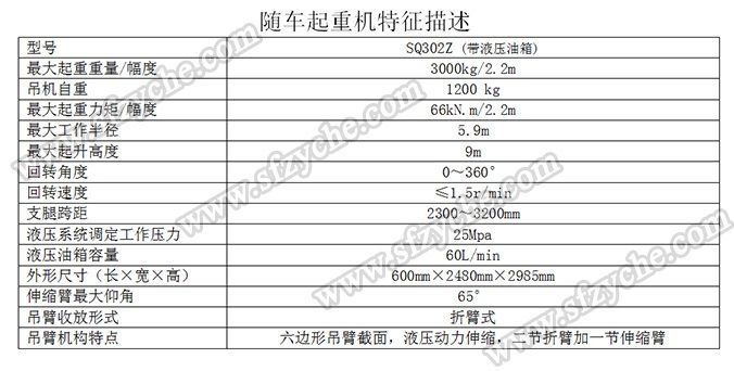 凈功率206kw; 起重機(jī)型號為:SQ302Z(帶液壓油箱),起重機(jī)質(zhì)量為:1200kg,最大額定超升載荷為:3000kg. 側(cè)防護(hù)金屬材料Q235斷面槽形,螺栓連接,斷面高度40mm,離地高度450mm; 后防護(hù)金屬材料Q235斷面槽形,螺栓連接,斷面高度135mm,離地高度500mm; 安裝具有衛(wèi)星定位功能行駛記錄儀,東風(fēng)越野隨車吊:www.hzqdme.com 吊機(jī)詳細(xì)參數(shù):