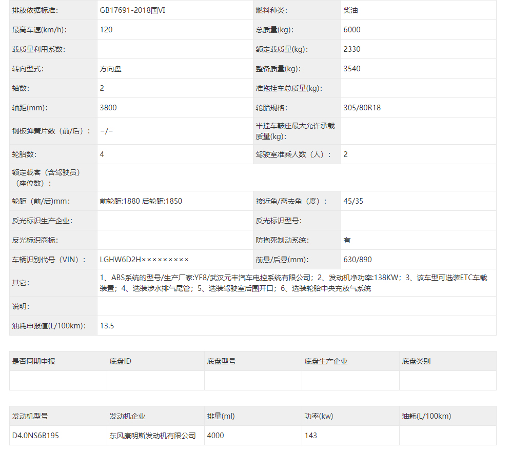 東風(fēng)猛士民用版EQ2063EYY6J型長頭單排四驅(qū)越野底盤其它參數(shù):1、ABS系統(tǒng)的型號/生產(chǎn)廠家:YF8/武漢元豐汽車電控系統(tǒng)有限公司;2、發(fā)動機(jī)凈功率:138KW;3、該車型可選裝ETC車載裝置;4、選裝涉水排氣尾管;5、選裝駕駛室后圍開口;6、選裝輪胎中央充放氣系統(tǒng);7、排放依據(jù)標(biāo)準(zhǔn):GB17691-2018國Ⅵ。